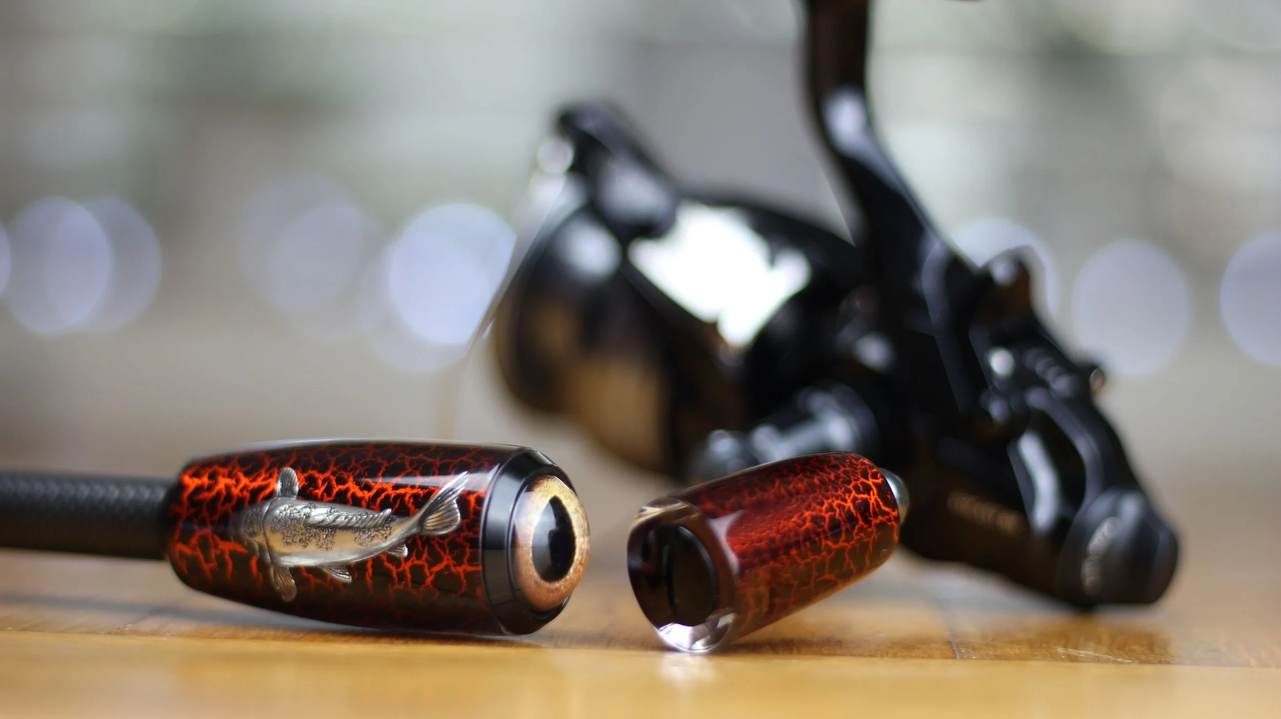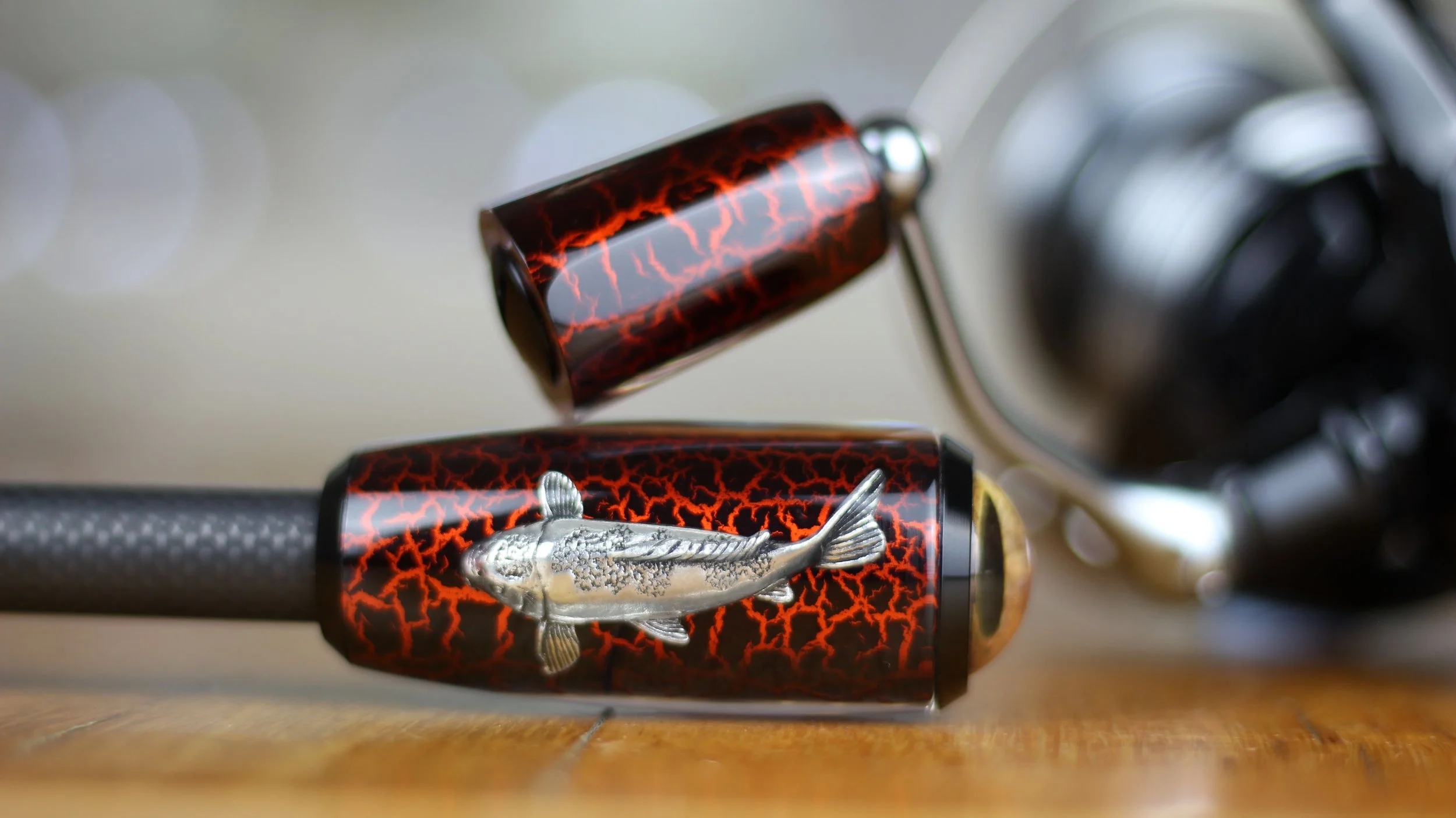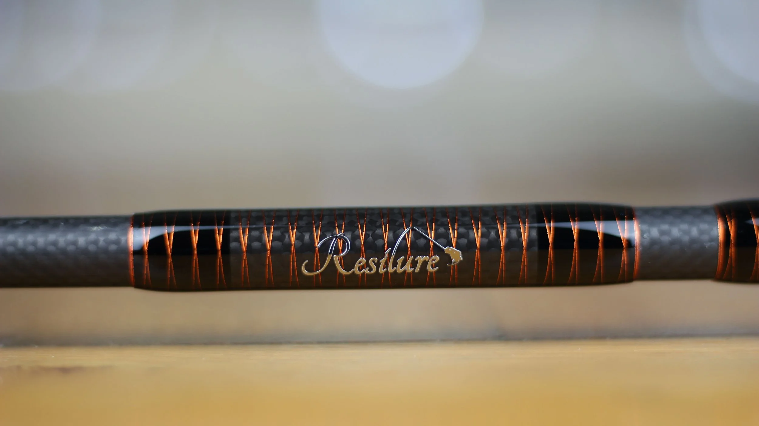 REEL SEAT - Fully modified ALPS ARD wave form reel seat ( unique to resilure , its 15% lighter and semi-flexible compared to all metal version), custom 2 tone amboyna burl wood reel seat insert with 3d metal carp. Matching butt , foregrip and rear grip all completely sealed and waterproof . Carp eye butt cap . Black Sea guide guides with decorative thread spiral wrap .